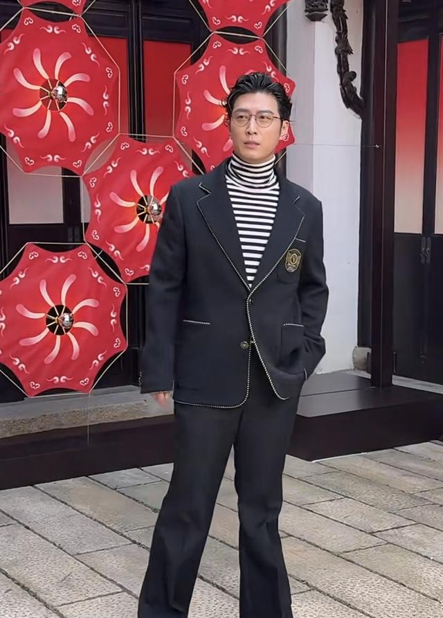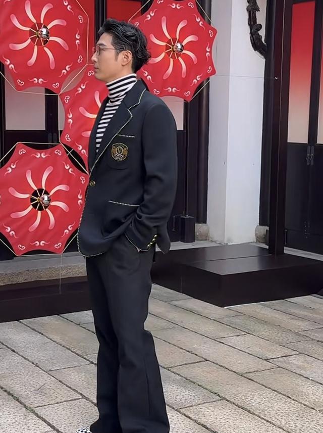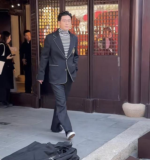 窦骁身穿一套黑色的英伦风西装套装。脚踩帆布鞋里面搭配条纹的高领上衣,戴着框架眼镜,还做了一头卷发的造型。他先出场,他出场站到中间的位置后便侧过身子,等着何超莲出来。