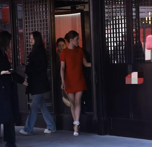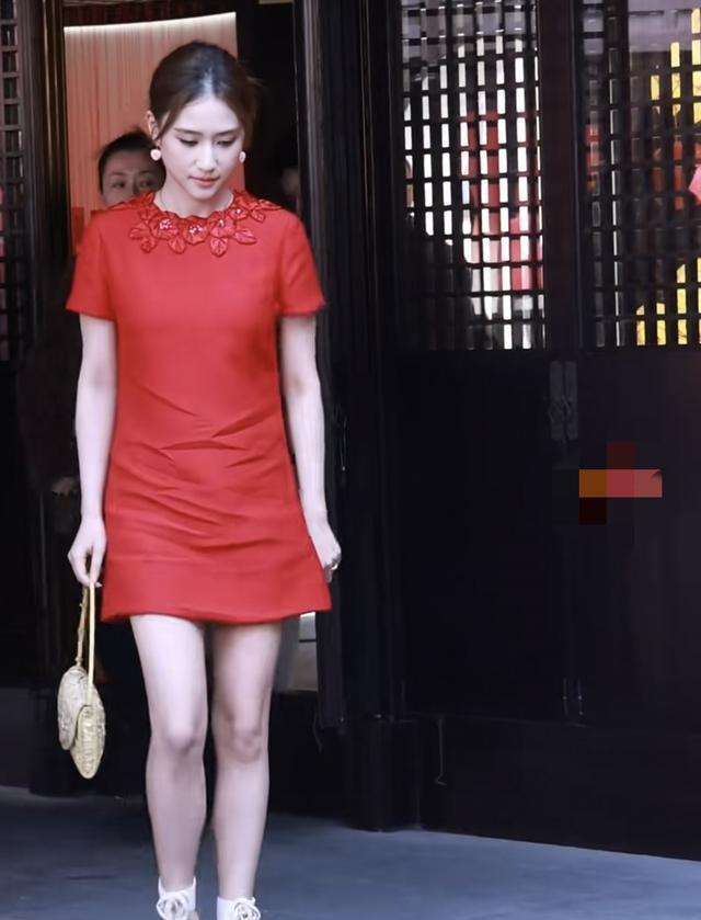 何朝莲身穿一袭红色短裙,脚踩白色高跟鞋,拎着金色的包包。 她皮肤真的好白,被红色的裙子衬托的更加的白皙。只不过她这个裙子上面褶皱太多了,有点减分。